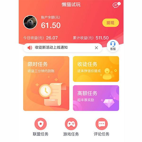 懒猫试玩,一款专业的苹果手机试玩APP赚钱平台,懒猫试玩操作简单,根据上面的提示完成应用安装试玩体验后可获得佣金收益,每天花2小时做任务,每个月多赚1000元,满10元可申请提现。同时邀请好友试玩可获得好友做任务收益的20%任务提成。 【赚钱特点】 1、下载赚钱单价1元起,每天下午3-5点大量更新任务 2、邀请好友享受下载做任务的100%佣金提成 3、最低10元起就可以申请提现啦 4、邀请好友赚20元+,还有首次做任务2-10元的额外奖励