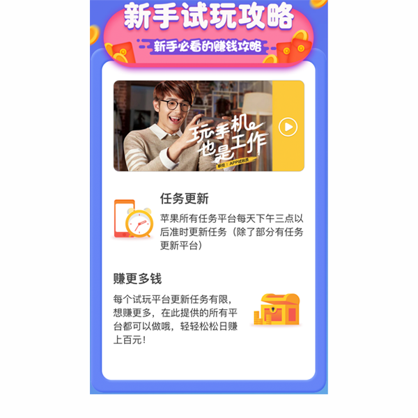 我们提供有20多个任务渠道平台。每个平台都是独立的,每个平台都有不同的任务,全部平台一起试玩,每天最少可以收入上百元!